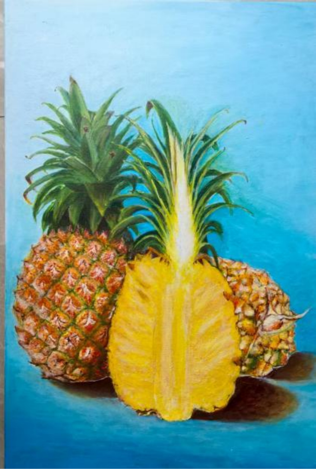 为了画它,我特地查阅了一些有关台湾凤梨的资料,于我而言这是一次学习,也对凤梨有了进一步的认识。原来台湾凤梨品种很多,其中有一个品种叫金钻凤梨,是凤梨中的上品,非常好吃。而且吃时不用工具,也不用浸泡盐水,徒手剥皮就可食用。而我们平时吃菠萝时,要用刀具或专用工具劈去外皮才可食用,所以人们普遍认为菠萝好吃,去皮困难。期待有一天能到台湾旅游,亲身品尝这种徒手即可剥皮去壳的上品凤梨——金钻凤梨。