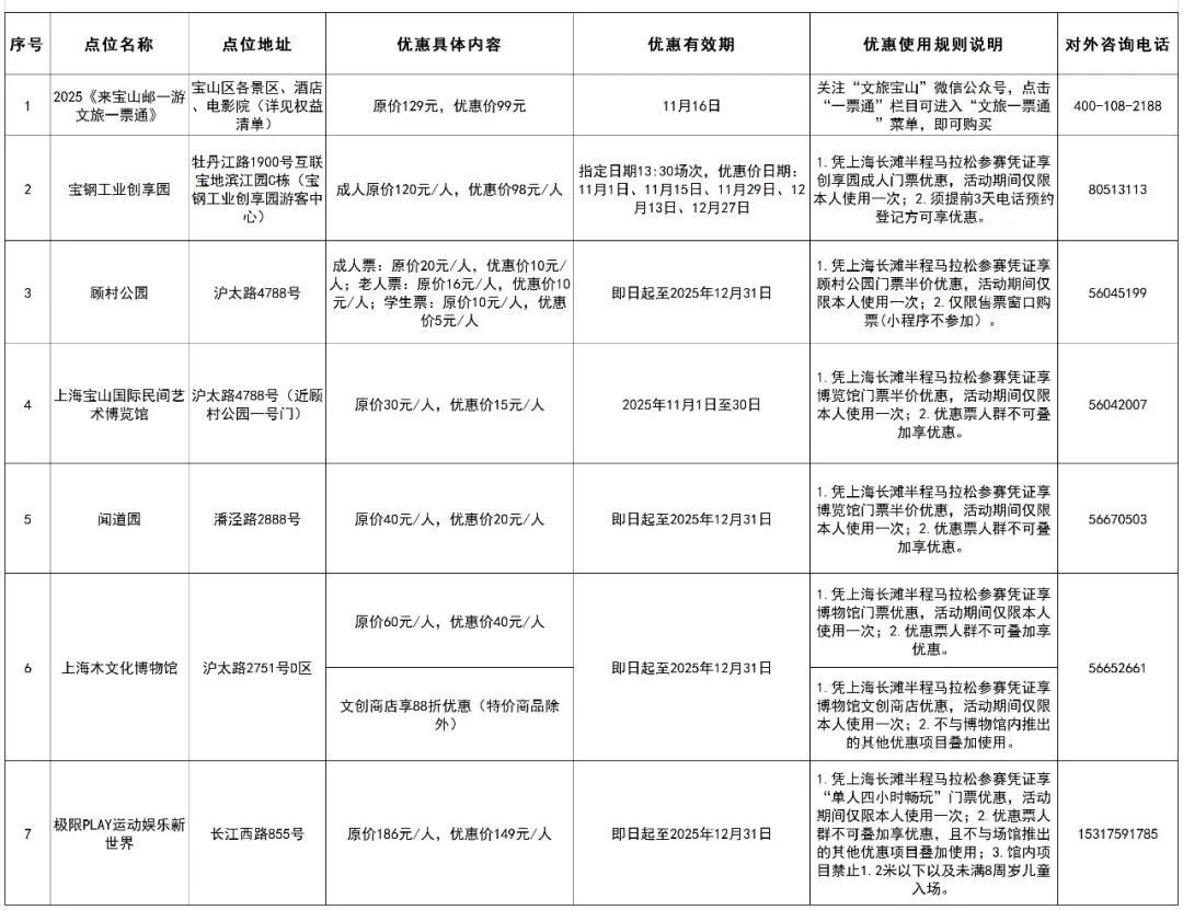 恭喜各位中签的跑者 你的幸运不止于比赛 之前已推出酒店和运动场馆福利 :@中签的幸运儿们 长滩半马中签后,这些体育场馆福利可别错过啦~ :@中签的幸运儿们,长滩半马住宿攻略来啦! 今天为你送上 超多景区景点福利 快来看看吧 上海长滩半程马拉松 景区景点福利 (点击图片可放大查看) 更多详细情况可拨打咨询电话了解 * 注: 1. 最终解释权归景区景点所有 2. 部分优惠需出示有效身份证件 ☎️监督电话 宝山区文化和旅游局 刘老师 56160182