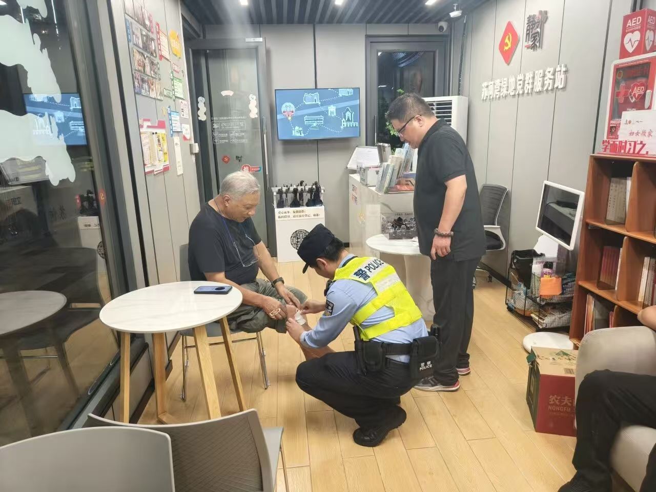 两位民警迅速将老人搀扶至就近的苏河湾绿地党群服务站。值班人员见状,立即取出站内常备的医疗急救箱,与民警协同开展救助。民警仔细询问老人摔倒细节,排查头部撞击等潜在风险;值班人员则轻柔地为老人清洗伤口、消毒止血、细致包扎,并递上温水安抚情绪。