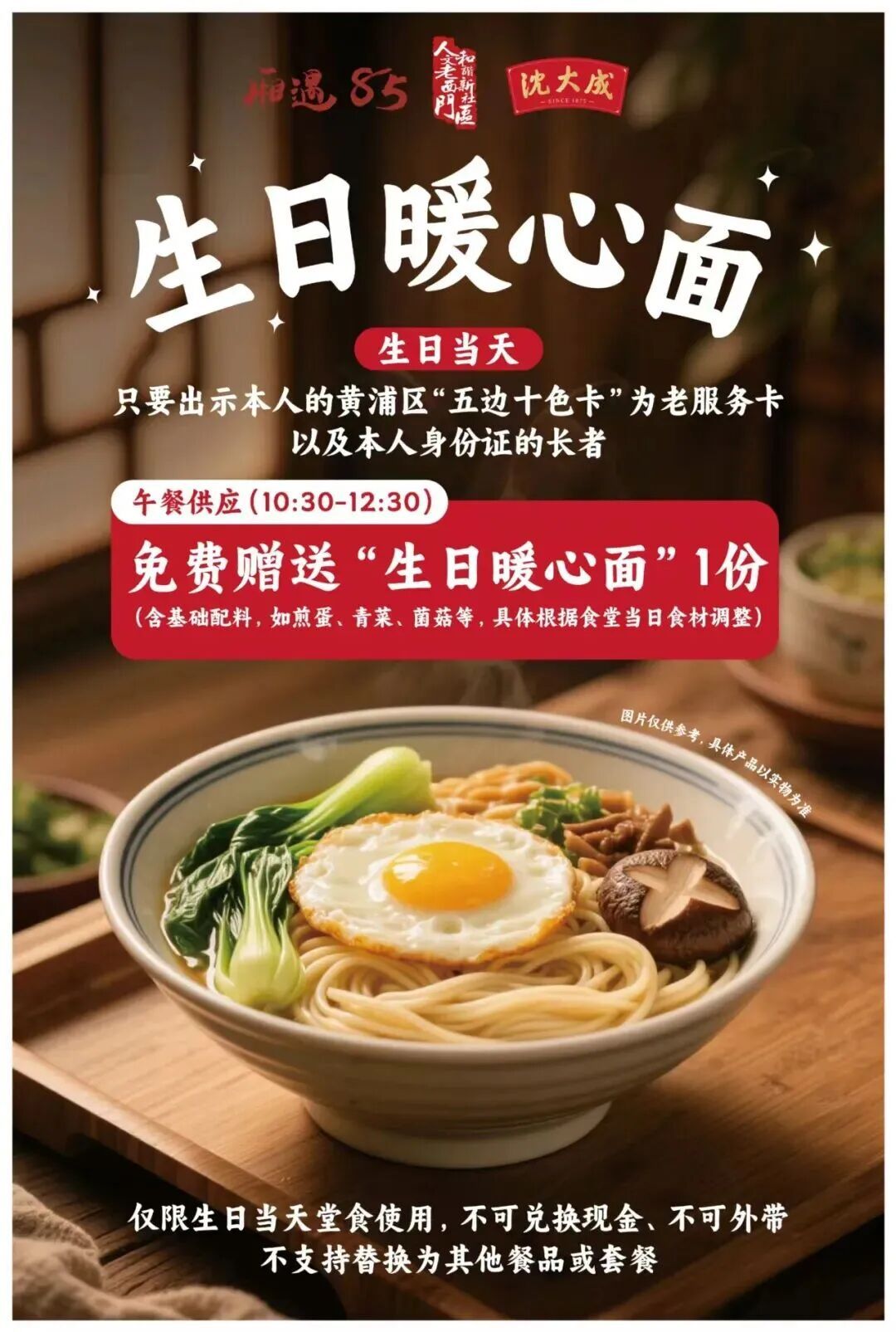 · 内容:生日当天凭本人身份证与“五边十色卡”,即可免费领取 “生日暖心面”1份(含煎蛋、时蔬、菌菇等配料)