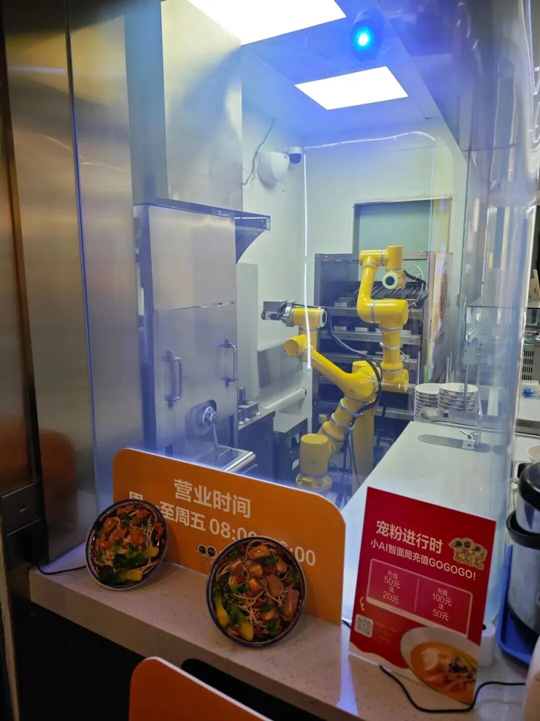 在上海世贸商城的AI食堂,智能机械臂熟练翻炒,另一位“机器人厨师”忙着擀面、煮面。这里少了传统厨房的喧闹,却多了科技带来的便捷与高效。附近工作的白领和社区居民们熟练地扫码点餐、取餐,在锅气与香气中感受算法技术加持的烟火味道。