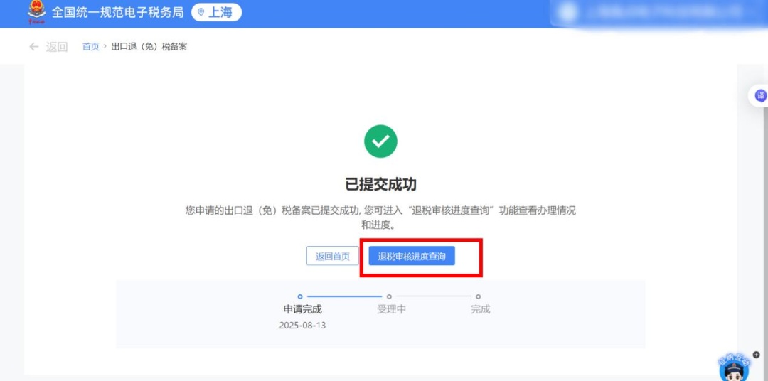 这样出口退(免)税备案申请就顺利完成提交啦!等着税务工作人员审核通过就行,你可以点击退税审核进度查询,查看办理情况及进度。