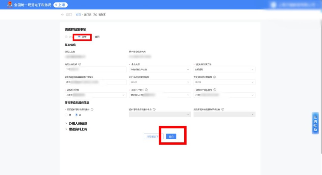 选择“变更”栏目,修改需要变更的备案信息,确认数据无误后,点击【提交】按钮后提交到纳税人当前退税税务机关,显示已提交成功。