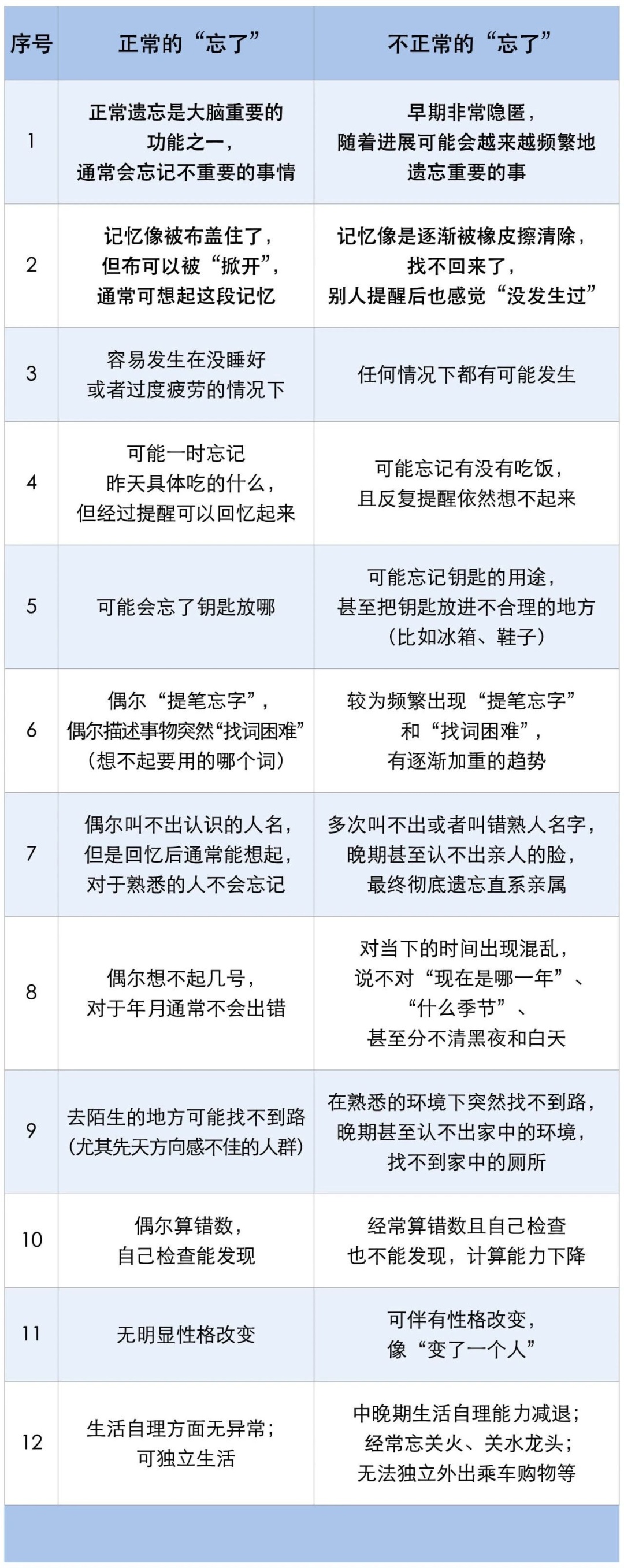 对于阿尔茨海默病这种不可逆的疾病来说,越早发现越有利于后期症状的改善!而早期发现的关键在于区分正常的“忘了”和异常的“忘了”: