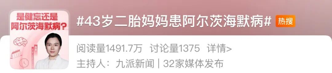 浙江省人民医院神经内科副主任、副主任医师张圣提到,自己去年接诊过一位43岁的二胎妈妈。这位女性原来是做会计工作的,35岁生下二胎之后,陆续出现记忆力减退、失眠等症状。起初,家人以为她只是健忘,没想到后来她无法正常工作了。“基本的计算功能已经完全丧失,只能辞职回家,平日被家人照顾着,到现在已有七八年,已经到大小便失禁的重度状态。”