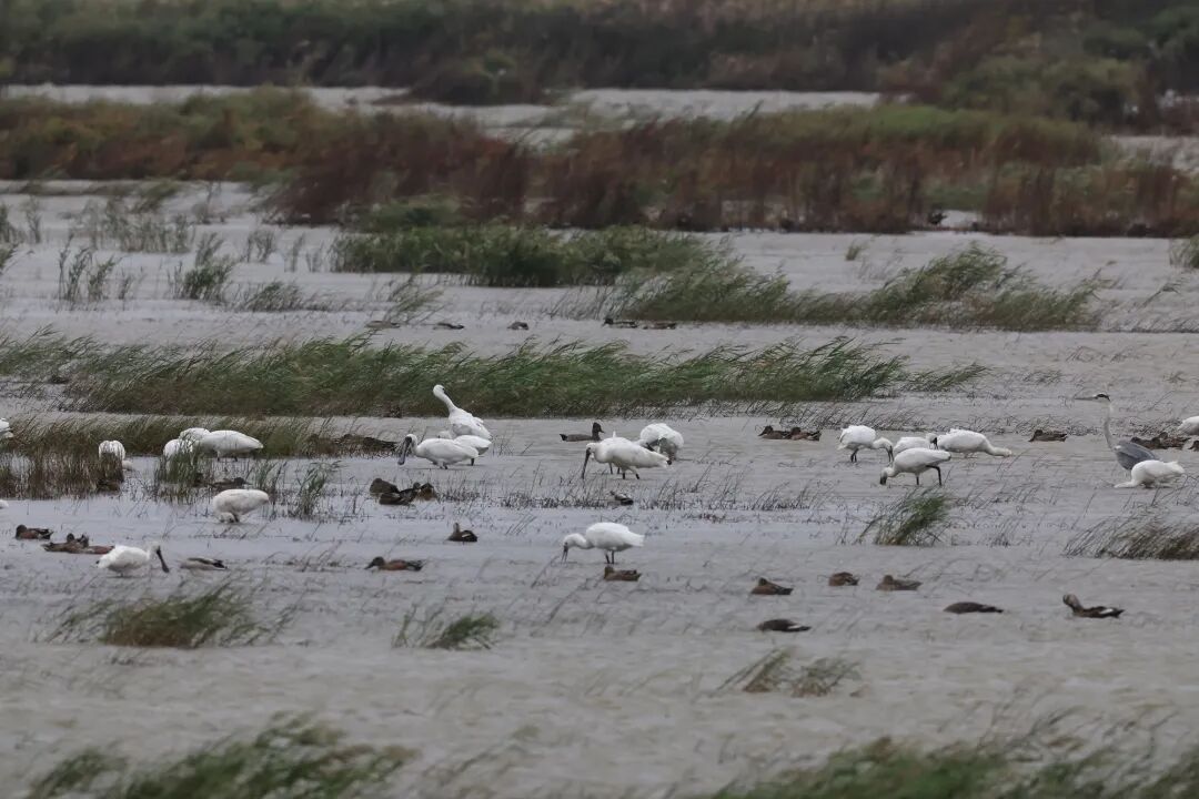 小天鹅、黑脸琵鹭、白琵鹭、豆雁、鸳鸯等国家一、二级重点保护动物相继抵达东滩。保护区生态修复区内,雁鸭类集群游弋、鸻鹬类低空翱翔,秋季迁徙候鸟与越冬候鸟在此齐聚,或在浅滩中梳理羽毛,或在芦苇丛边寻觅食物,动静之间尽显生机与活力。