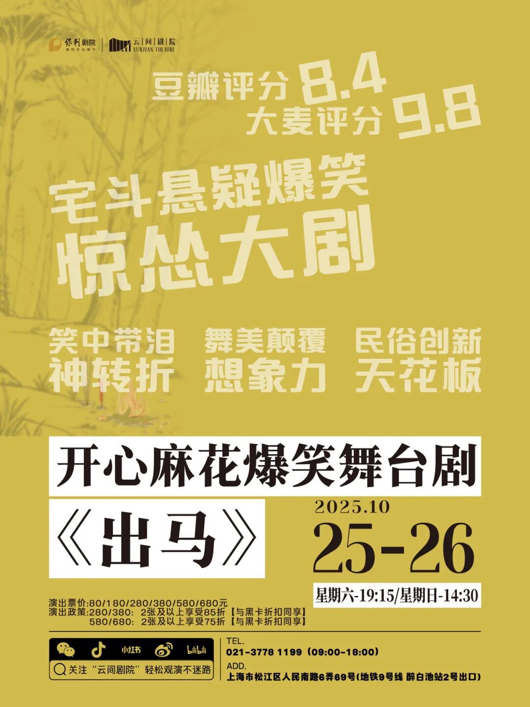去年 开心麻花“爆笑”喜剧《出马》 亮相云间剧院 现场座无虚席 本周末 《出马》再度蓄势待发 将在松江连演两场 这部开心麻花近三年最高分的黑马喜剧 叠加了悬疑、民俗、古风等元素 故事情节紧凑,层层递进 同时,笑点密集 让你笑足150分钟 这个周末 来云间剧院 开启这场属于欢乐的盛宴