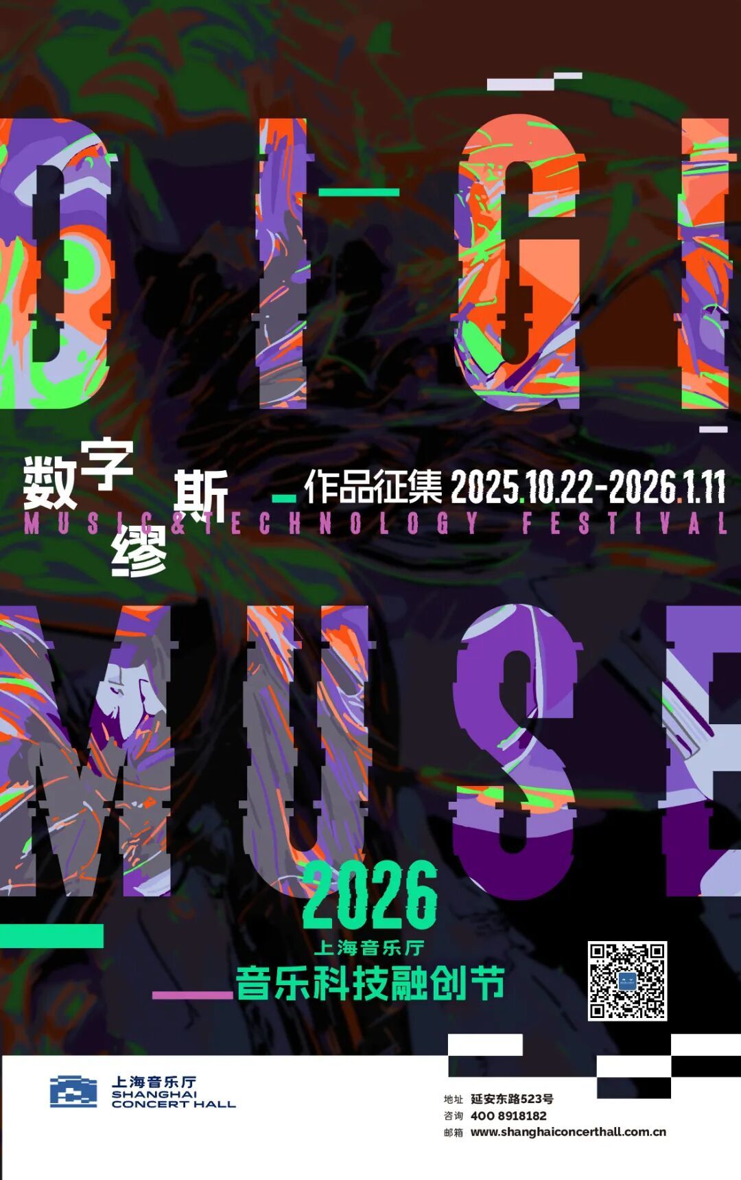一、报名作品须为原创作品,且符合音乐科技融创节的主旨精神,显现出较高的艺术性、创新性及表演技能,并能突出音乐与科技融合创新。 二、作品类型: 1、 音乐演出 :总时长不少于50分钟;需有现场音乐表演;表演内容需具有较完整的创意概念策划;优先选择首演作品。 场地:上海音乐厅B2音乐立方/四楼响空间 2 、声音装置:利用创新手段,通过互动与多感官体验来构建独特的声音艺术作品,优先选择可交互作品。 场地:上海音乐厅户外空间/室内空间 3、数字影像:融合音乐内容与影像内容形成的完整作品,时长不限。动态影像、交互视频、实时生成视觉、音画互动装置等融合音乐与影像的数字作品。 场地:上海音乐厅户外空间/室内空间 4、建筑投影:根据指定建筑载体创作Mapping作品,时长:2 -3分钟,优质作品将有机会上墙投影。 场地:上海音乐厅南面墙 5、XR作品:使用XR技术创作的以文化艺术为主题的作品,用户可进行互动体验。 场地:上海音乐厅户外/四楼空间 6、上海音乐厅与上海图书馆东馆联合征集特别主题:《诗经》草木意象 以《诗经》中的诗歌为创作基底,通过数字影像与音乐的交融,重新诠释传统诗歌所描绘的草木情景、情感与自然意象,并建立与现代生活的互动对话。作品需强调沉浸感、交互性与美学创新,探索古典文化在数字时代的再生。 场地:上海图书馆东馆展厅/上海音乐厅户外空间/室内空间 全球艺术创意人才,年龄不限,个人/团体申报皆可。 即日起至2026年1月11日|作品征集 2026年1月-2月|作品评审及前期筹备 2026年3月-5月|作品展演 1、展演场地及基础设备支持: 为入选作品提供上海音乐厅室内/户外相应作品的适配空间作为展演场地支持,包含场地内的乐器、音响、灯光、投影等基础设施设备。 2、合作模式: 部分入选项目将根据具体项目的运营机制获取票房收益分成(具体分成比例另行洽谈)。 3、宣传营销支持: 入选项目将由上海音乐厅进行全面的宣传营销推广,包括不限于宣传品设计制作、媒体报道、票务渠道销售等。 4、专业指导与咨询: 为入选项目提供来自业内专家的指导,包括艺术创作、技术实施、市场策略等方面的支持,帮助艺术家和团队更好地实现创意构思。 5、跨界合作机会: 不同板块的入选团队可进行跨界合作,促成不同艺术形式之间的交流与融合,创造新的艺术表现形式。 6、合作推广: 为入选项目推荐至全球演艺平台,积极助力全面的商业合作 ;邀请部分作品参与未来的上海音乐厅演出季。 1、报名表:《2026年数字缪斯-音乐科技融创节报名表》1份; 扫描 二维码获取报名表 2、作品视频: 音乐演出类|提交小样或排练/演出视频资料 声音装置类|提交作品演示视频或实拍视频 数字影像类|提交作品视频 建筑投影类|提交作品视频 XR类|提交作品演示视频 3、主创及主演人员介绍 4、策划方案(PDF格式,须包含主题概念、技术要求等) *特别说明: 上海音乐厅与上海图书馆东馆联合征集特别主题提交规格: 1) 视频类:分辨率不低于1920×1080,格式为MP4/MOV 2) 交互类:需提供可执行文件或网页链接(兼容主流浏览器及设备),并附技术说明文档。 3) 附创作阐述(500字内),说明灵感来源、技术实现与互动设计理念。 请将资料递交至以下邮箱: DIGIMUSE@shanghaiconcerthall.com.cn 邮件名:作品名+负责人姓名 咨询电话:53866666-8023 *请以网盘链接方式递交音视频资料。 *递交内容不得侵犯第三方的合法权益;不得出现抵触国家法律法规的内容。 *本活动最终解释权归主办方所有。 数字缪斯 2025音乐科技融创节 精彩瞬间 以“数字激发音乐灵感”为题, 带来1台“特别呈现”特邀展演作品、 4部原创展演作品全球首演、 4场工作坊、1个展览、1场研讨会、 1次创投分享会, 在春天的上海留下“音乐+科技”新声。 超过2万名观众相聚上海音乐厅 在这个AI与人类共创的时代, 通过科技与艺术的深度跨界, 前沿技术赋能创作者协同共创, 破圈思维拓展音乐产业维度, 共绘音乐与科技未来图景。 这一场聚焦“音乐科技”的音乐聚会 我们因音乐而聚,积极拥抱科技 共同缔造了一段难忘的音乐记忆 来看看精彩全记录吧 跨界融合,搭建全球艺术家实验场 多部优秀创意作品首演首秀 融创节展演板块以“跨界实验”掀起艺术浪潮,4部全球首演作品彰显技术与人文的共振。 4位在国际与国内具有影响力的行业专家、艺术家评审的加入,对展演板块入选作品进行遴选指导、推荐与支持,为音乐创作的无穷可能性助力。 展演01 《未来诗·古筝与AI视听音乐会》 左右滑动查看音乐会图集 4月4日-5日,“数字缪斯——2025音乐科技融创节”展演作品开篇之作《未来诗·古筝与AI视听音乐会》由艺术家组合“王萌+于淼”领衔,通过古筝泛音与AI算法波频的交织,构建了一场“不完美协作”的诗意实验。