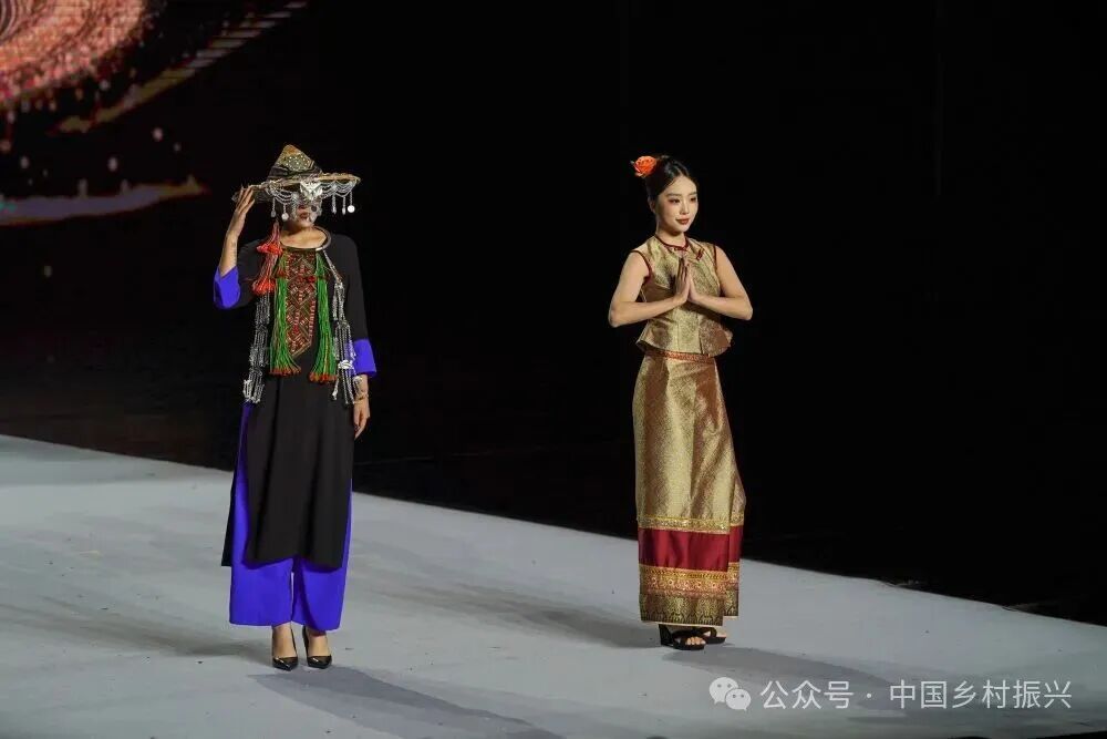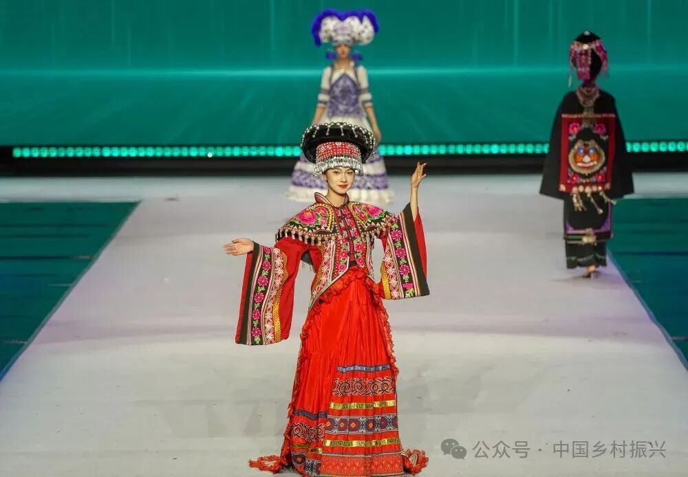 霓虹映照下,楚雄大剧院内织锦流光、彩绣生辉。T台上,融合了彝绣传统纹样与现代剪裁的服饰随灯光流转次第登场,在中外模特的专业演绎下,衣裙间深山彝寨的古老图案在聚光灯下熠熠闪烁。