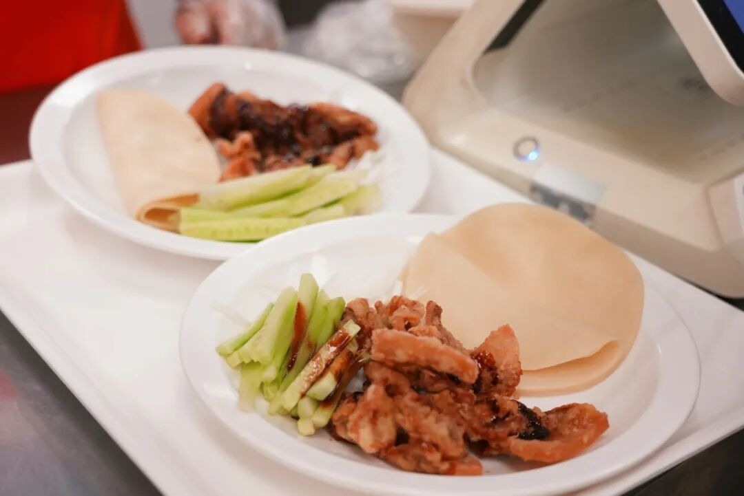 后厨里,师傅正现场炸制酥肉。里脊被炸得外表金黄焦脆,内里却保留着肉的鲜嫩。配合黄瓜葱白、甜酱薄饼,入口酥香四溢,层次分明。