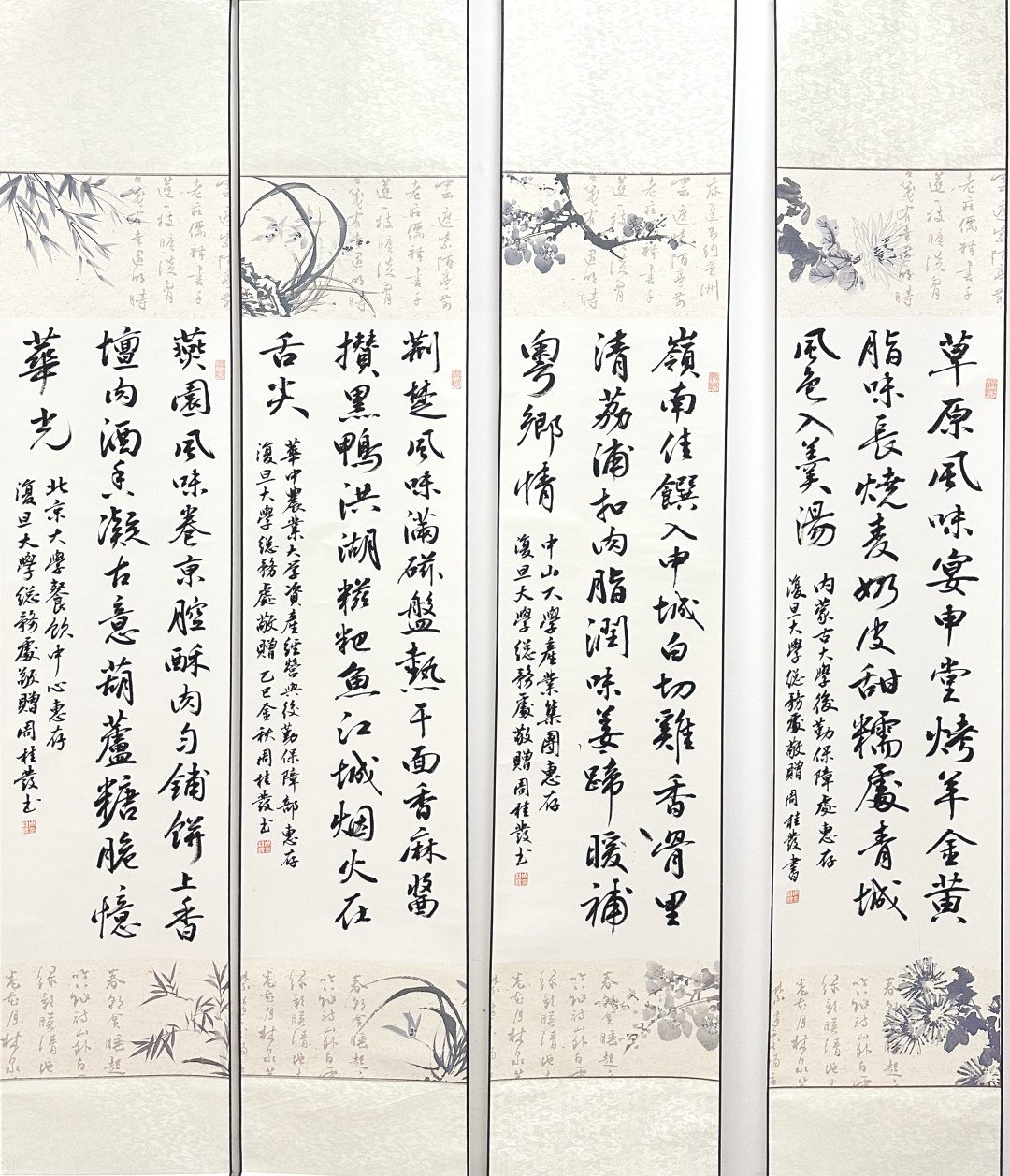 为感谢各位大厨携美食与文化而来,复旦也准备了一份特别的礼物。老干部党委书记、退休工作处处长周桂发老师,亲笔为四所高校的大厨团队题写了四幅书法作品。这些作品均以“七言绝句”形式创作,巧妙地将各校的招牌菜名融入诗中,以翰墨凝香,致敬四方风味。这份雅致赠礼,将舌尖风味升华为笔尖诗意,成为此次美食文化节中最富人文温度的注脚。