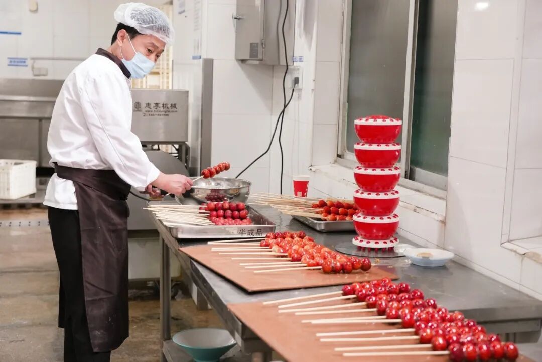 上午10点半,旦苑食堂一楼,北京大学的窗口已排起长队。师傅们现场制作的冰糖葫芦成为最大亮点,晶莹剔透的糖衣包裹着红艳的山楂,酸甜可口。一抹亮红色,招徕路过师生源源不断的注目问询。