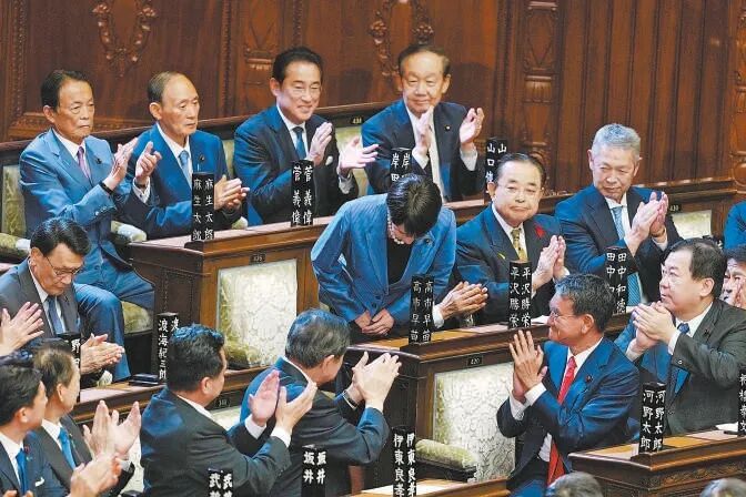 10月21日,在日本东京,自民党总裁高市早苗(中)在临时国会众议院首相指名选举中胜出后起身致谢。 新华社发