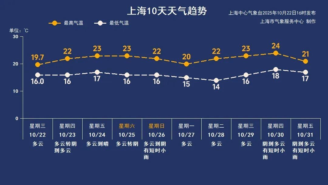 未来几天,申城将迎来一段久违的舒适天气。最高气温在20~24℃之间小幅波动,白天较为适宜;最低气温在14~18℃之间,夜间有些凉。26日、30~31日前后受弱冷空气影响,会出现微弱降水,其他时间以多云为主,较为晴朗干燥。我们期待了很久的秋高气爽终于来了!