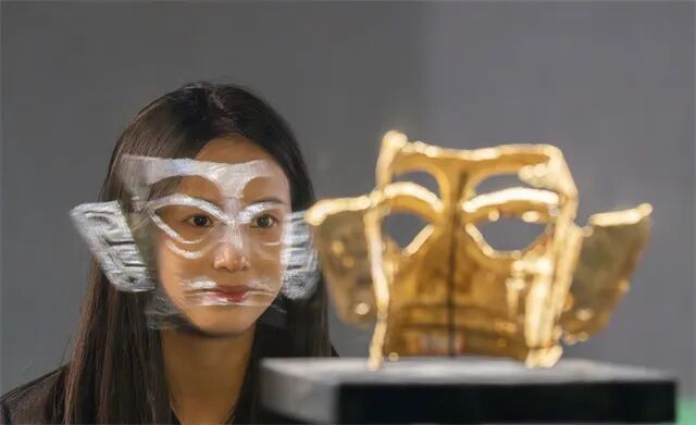 参观者在三星堆博物馆新馆展厅内观看展出的黄金面具