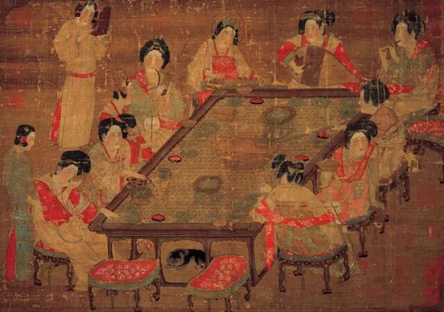 《唐人宫乐图》局部,描绘了宫女围桌饮宴的场面,可以看出此时合食已经出现