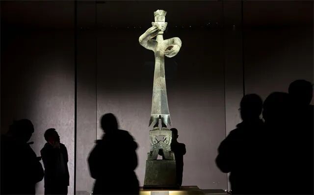 观众在三星堆博物馆新馆展厅内参观青铜大立人像