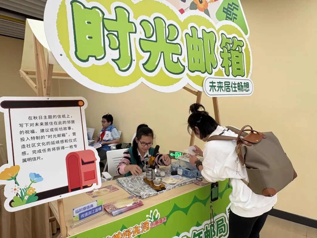 “未来居住畅想”板块里,上海凤城少年邮局设置 “时光邮箱”,孩子们在秋日信纸上写下对街坊未来的祝福与建议,投入邮箱后将形成社区共建档案;“杨杨直播间”内,红领巾小记者与少年宫未来媒体人社团开展街采快闪活动,用童言童语收集大众关于“未来社区”的创意构想。