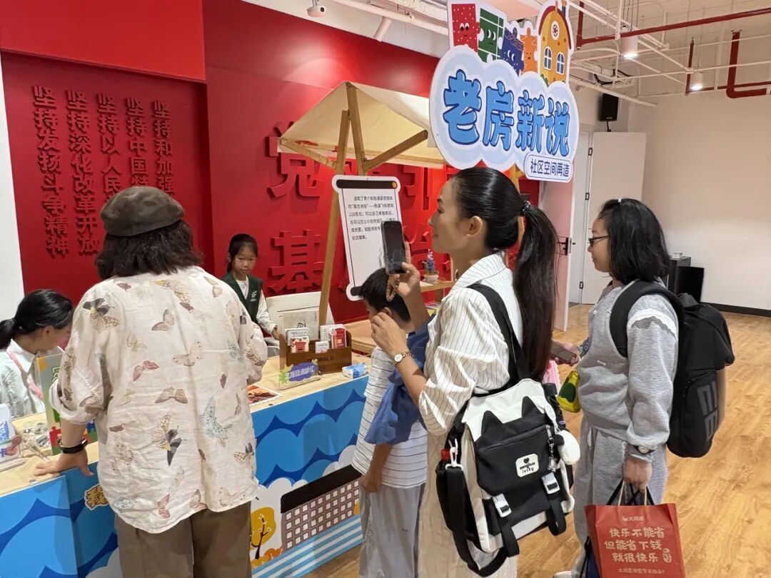 “社区空间再造”板块中,“声影变迁”摊位由少年宫影视社团搭建迷你配音间,参与者可为经典影片中的弄堂生活片段进行拟音配音练习,沉浸式重现里弄生活氛围;“老房新说”环节由杨浦少年邮局设计“杨浦滨江 +228街坊”双面拼图,完成拼图的参与者可获得专属纪念邮戳,以此串联起杨浦居住变迁的时空线索。