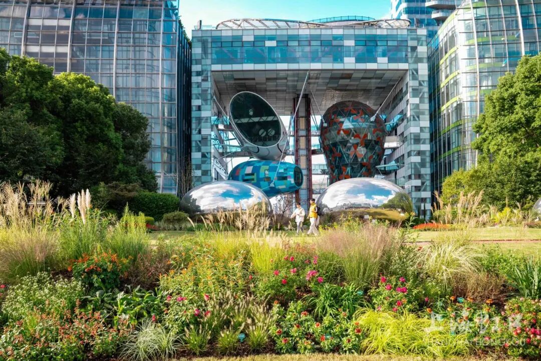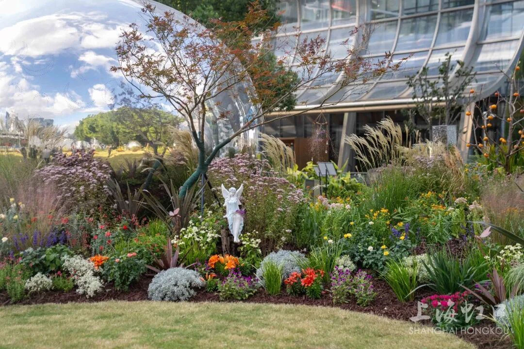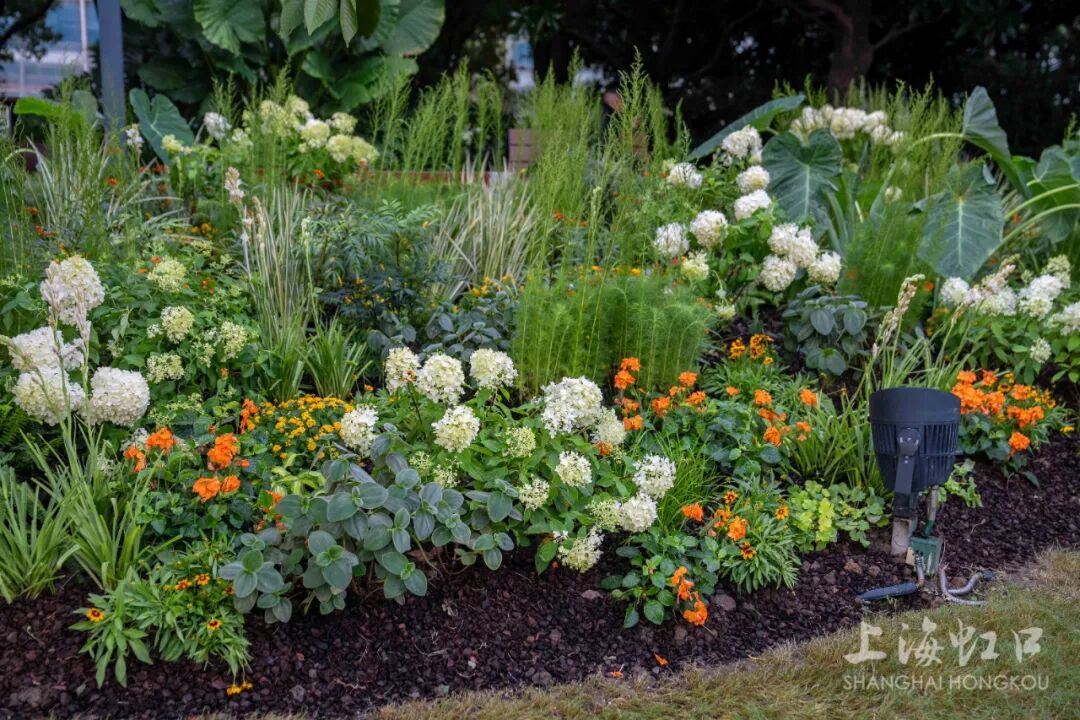 如音乐之门大草坪前杭州代表队的作品,以“流动的脉搏”为主题,打造蜿蜒曲折的水韵花境。“我们的设计灵感,来自于上海的黄浦江,也来自于我们杭州的西湖、钱塘江。整个花境呈水滴形状,里面配置高低错落的各色植物,形成水体流动的效果。”杭州代表队主创设计师介绍道。