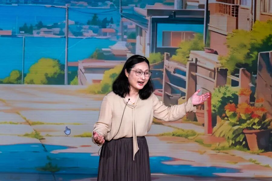 在“歌唱方法”环节,她以趣味游戏为载体,带领孩子们体验“弯腰V”“剪声音”“穿小孔”等气息练习,还通过数数字开展多声部节奏训练,让抽象的歌唱技巧变得可触可感。在“数字赋能歌唱”板块,她展示了学校艺术节和“AI创作”栏目的学生音乐作品,其中《教室窗外的风》由AI辅助生成,音符间流淌着科技与情感的交融。