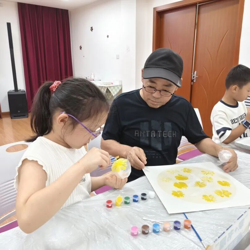 翻开绘本,亲子家庭跟随贝儿的脚步领略秋季的西北风光。随后开展的手工环节,成为亲子协作的温馨时刻。亲子家庭在老师的指导下,先用胶带纸在画纸上贴出“秋”字,再用保鲜袋蘸取颜料并印出花朵,接着点缀上花蕊和绿叶,最后撕下胶带,一幅秋分创意画便跃然纸上,将绘本中象征美好和友谊的凤仙花一同定格于画中。