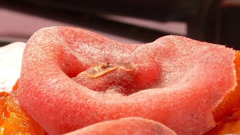 柿饼表面的一层薄薄的糖霜,其实是柿子在晒制、翻面、再晒的过程中自然形成的,不过如果存放柿饼的室温较高,糖霜会自己慢慢消失,所以建议大家买回家后放在冰箱保存。