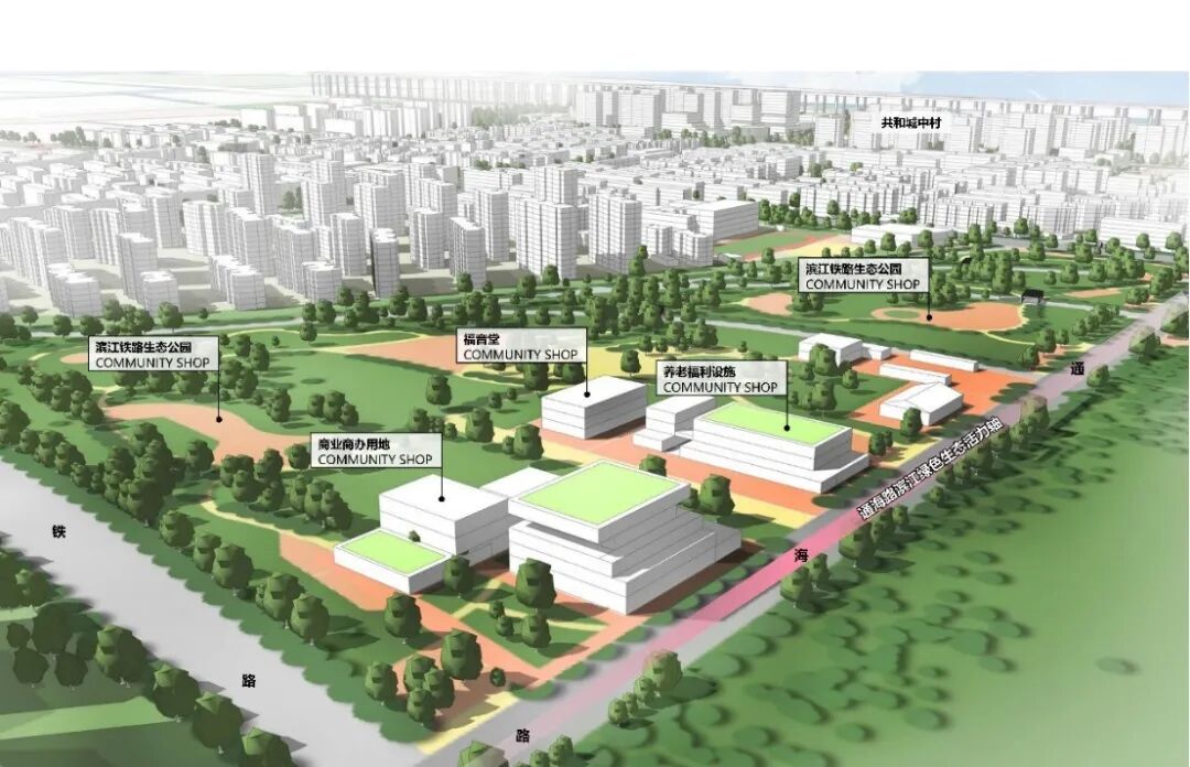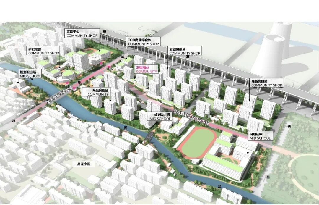 共和村规划示意图。可见TOD商业综合体、规划幼儿园及初中、文体中心等