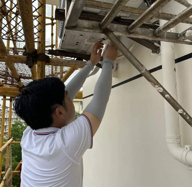 除了科普宣传,社工们还把精准服务落到细微处。针对不少居民反映的空调冷凝水接管难题,他们提前整理了常见品牌专用出水接头型号清单,主动上门指导居民选购合适的配件。当居民备好材料后,社工们又化身“安装小分队”,带着工具包免费上门服务。李阿姨家的空调外机位置特殊,自己操作困难,社工小张二话不说,随即细致地完成了安装。“既专业又耐心,真是帮了我大忙!”李阿姨连声道谢。