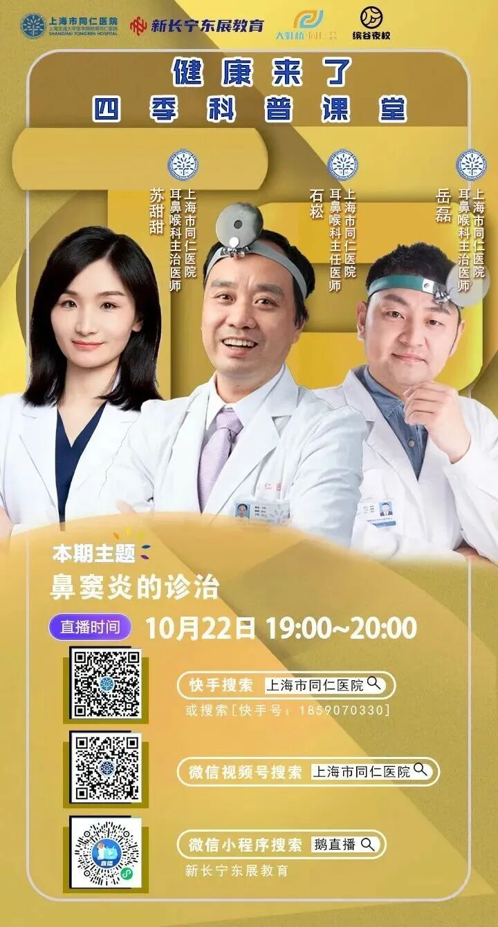 今天(10月22日)19:00—20:00,“上海长宁”App将与上海市同仁医院“大虹桥·同仁荟健康直播”共同直播:鼻窦炎的诊治。