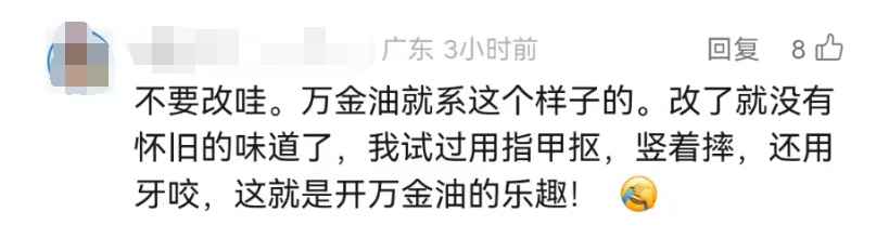 近日,多位博主发布视频调侃铁盒的清凉油是“最犟种产品”,“开车犯困的时候,想用清凉油提神,结果车开出了300公里,指甲都抠破了,盖子还没打开,最后也不困了。”还有网友称,从记事起清凉油就是这个铁盒包装,多年过去,盖子依然难打开,“任性又死不悔改的设计”。