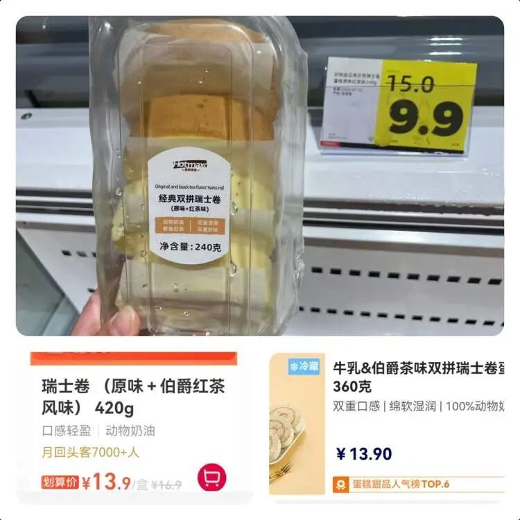 但瑞士卷的价格则无优势。标注使用了动物奶油的原味+红茶味的双拼瑞士卷,240克卖9.9元;与盒马NB同口味双拼420克13.9元、奥乐齐360克13.9元相比,换算为同规格后还是后两者更划算。