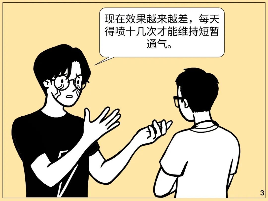 从那以后,这瓶小小的鼻喷剂成了他离不开的“救命稻草”,时不时要拿出来喷两下。但神奇的效果只维持了几个月,最近几周,他每天得喷十几次才能维持短暂通气,晚上睡觉还会憋醒,白天总觉得头晕、犯困。