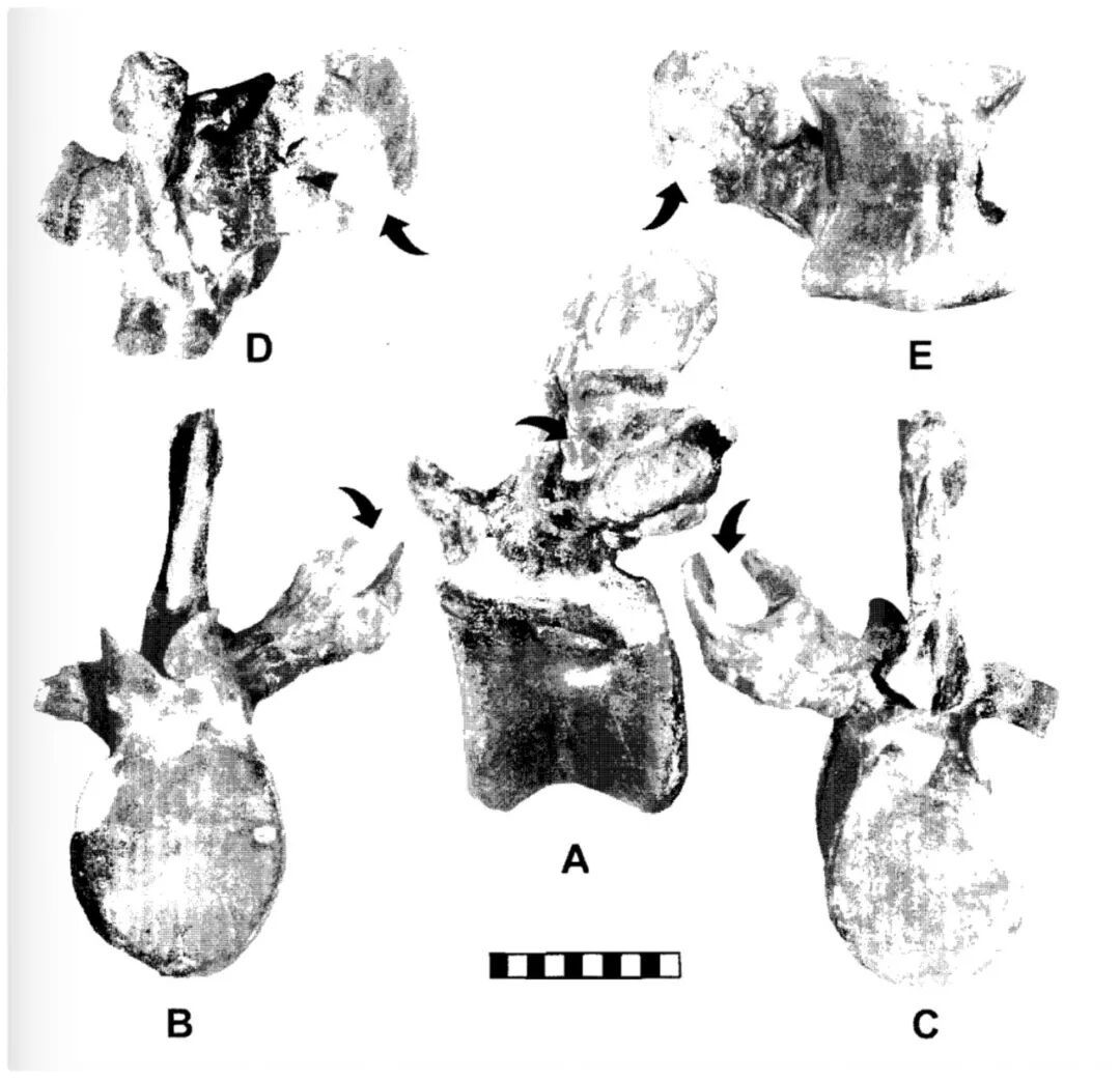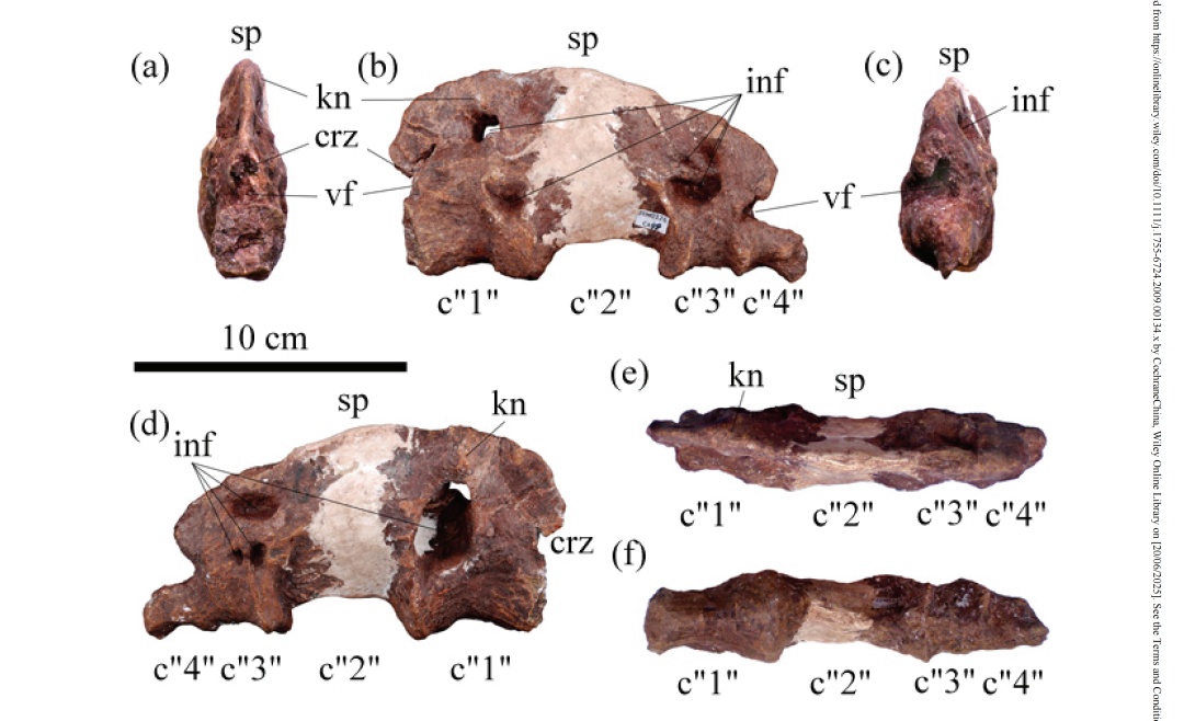 包裹神经的骨头向两侧鼓了出来,尾巴横着看变宽了不少;骨头中间的“神经通道”变大了,能通过更粗的神经;而原本竖着往上的骨刺,也叫神经棘,长得更高了。经过详细的研究,2001年,来自自贡恐龙博物馆的研究者将新发现的材料归入合川马门溪龙,同时给它这样的尾巴取了个名字——冠状尾,以区别于正常的尾椎形态。