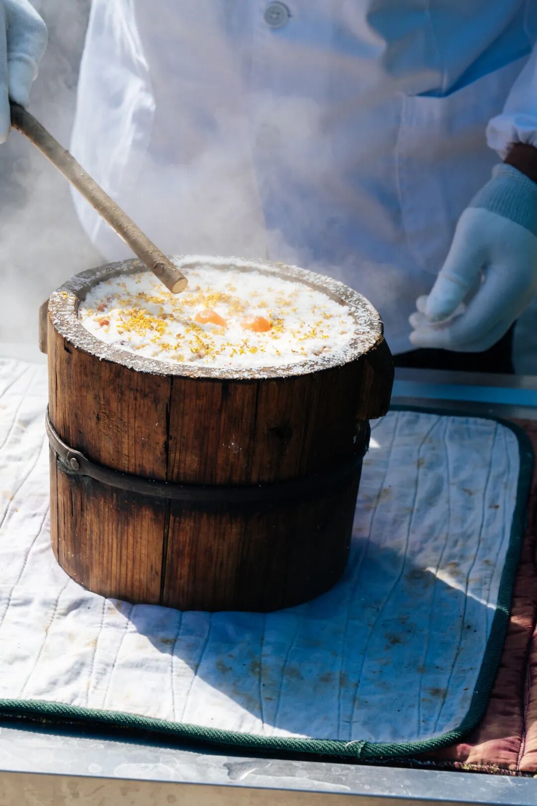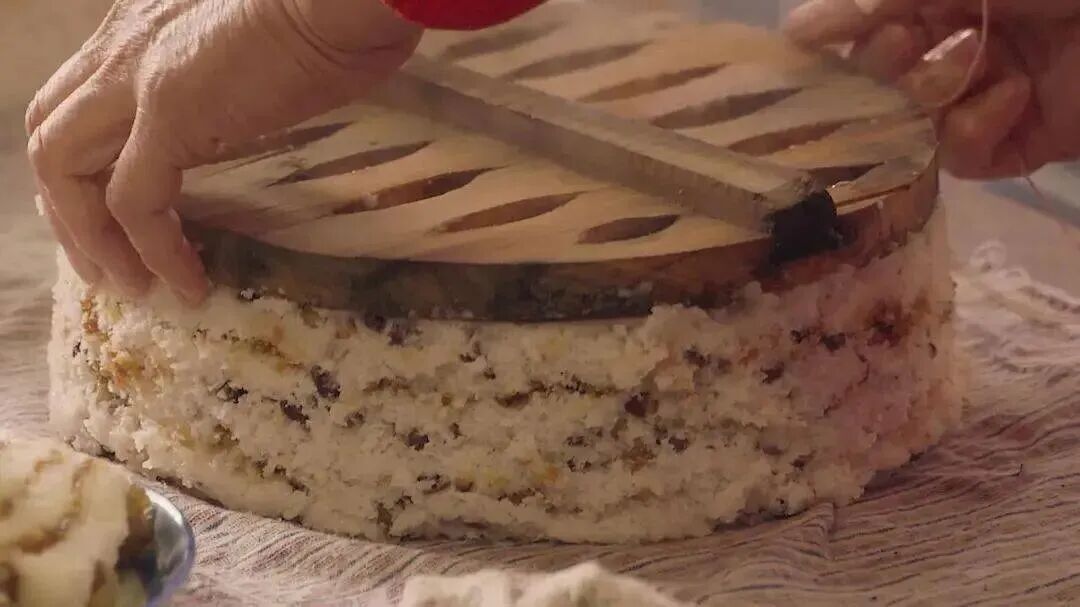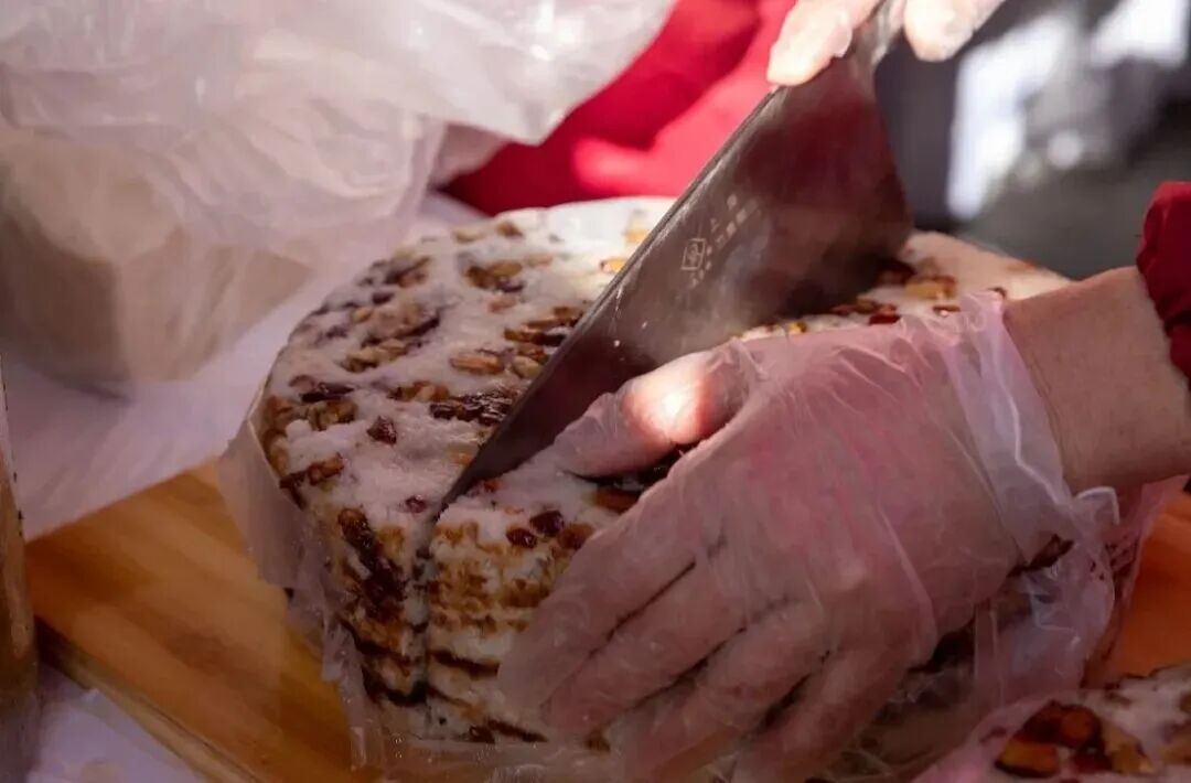 在颛桥,蒸制桶蒸糕已有百年历史 最常见的颛桥桶蒸糕 直径约30厘米 除了“个头”大,使用杉木桶蒸制 也是颛桥桶蒸糕技艺传承人坚持的选择 至于口感,当然是一吃难忘! 绵密层叠,形似千层 放入赤豆、蜜枣、核桃等 入口松软,清甜不粘 常年稳坐颛桥糕点界“顶流” 人气火爆,热度长盛不衰! 七宝农家糕