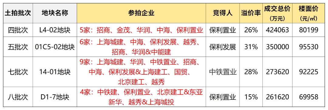 对比4块地的参拍企业,不难发现一批长期深耕杨浦的“老朋友”,如保利发展、保利置业、中海、北京建工、越秀、招商等。这些企业并非首次在杨浦拿地,而是已在此成功开发项目并取得优异销售业绩后,再度挥师入局。