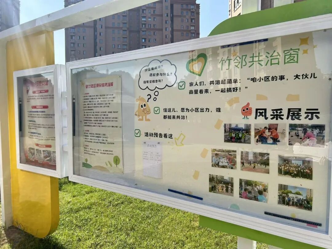 在大家的齐心协力下,凉亭内外焕然一新。凉亭周边,崭新的宣传栏不仅展示“竹邻同心”党建品牌信息、发布便民服务预告,还呈现居民的才艺作品,成为花园中一处信息透明、人文盎然的亮点空间。