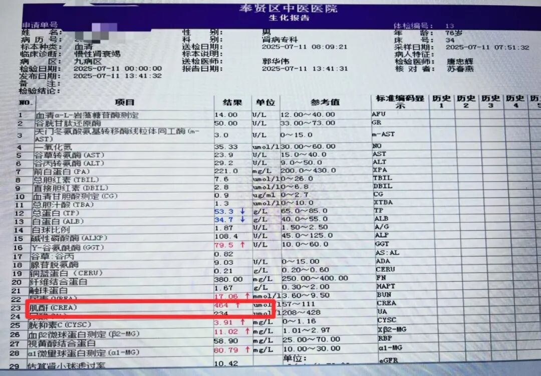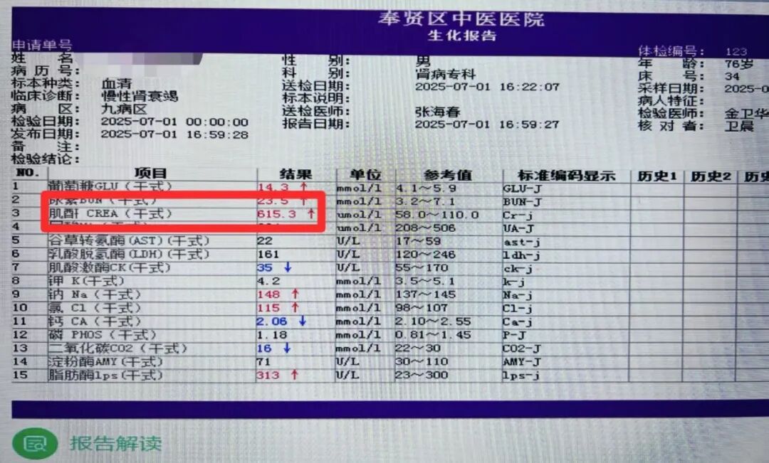 郁伯伯住院中药灌肠治疗10天,加之纠正酸中毒等治疗,血肌酐从入院时615umol/L,降至464umol/L,满意出院,门诊继续随访。