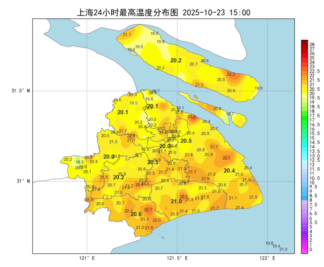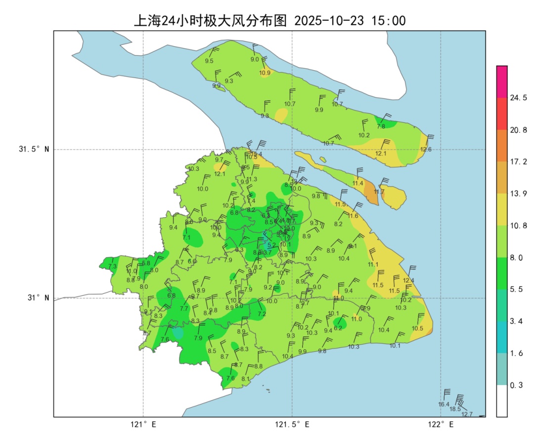 上海今天上午阳光理想,秋高气爽,中午前后受海上冷流云系影响,云量增多。市区徐家汇站全天气温在14.6℃-20.0℃,最低气温再刷下半年新低。午后起风力也有所增大,陆地6级阵风,沿江沿海地区有6~7级阵风,风大加上气温偏低,秋凉明显,早出晚归还是要一件挡风保暖的外套。