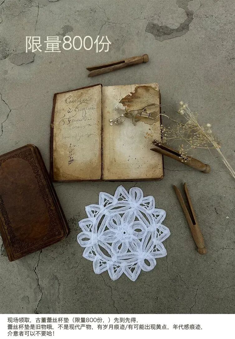 现场准备了800份古董蕾丝杯垫和1000份明信片作为伴手礼,满满的岁月痕迹,喜欢中古的你一定要冲!