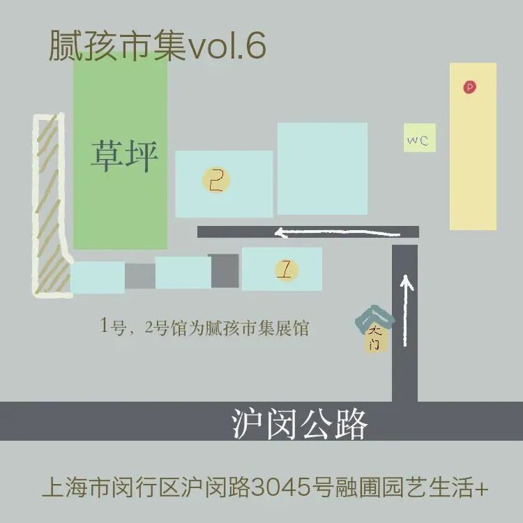 本次市集坐落于闵行颛桥——融圃园艺生活+,你可以在玻璃花房淘物、大草坪或花海拍复古电影感美照。
