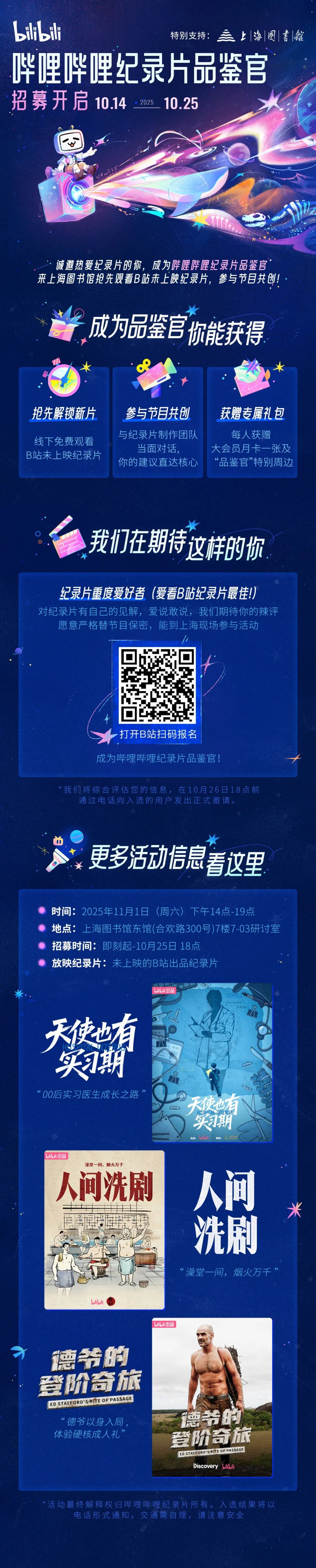 本次活动为你准备了B站未上映纪录片的首批观影席位,诚邀你成为“哔哩哔哩纪录片品鉴官” 。在这里,你不只是观众,更是与B站纪录片展开深度对话的伙伴,你的想法将直接点亮创作的灵感。好片子,你说了算,和B站纪录片一起,共创下一个打动人心的作品!