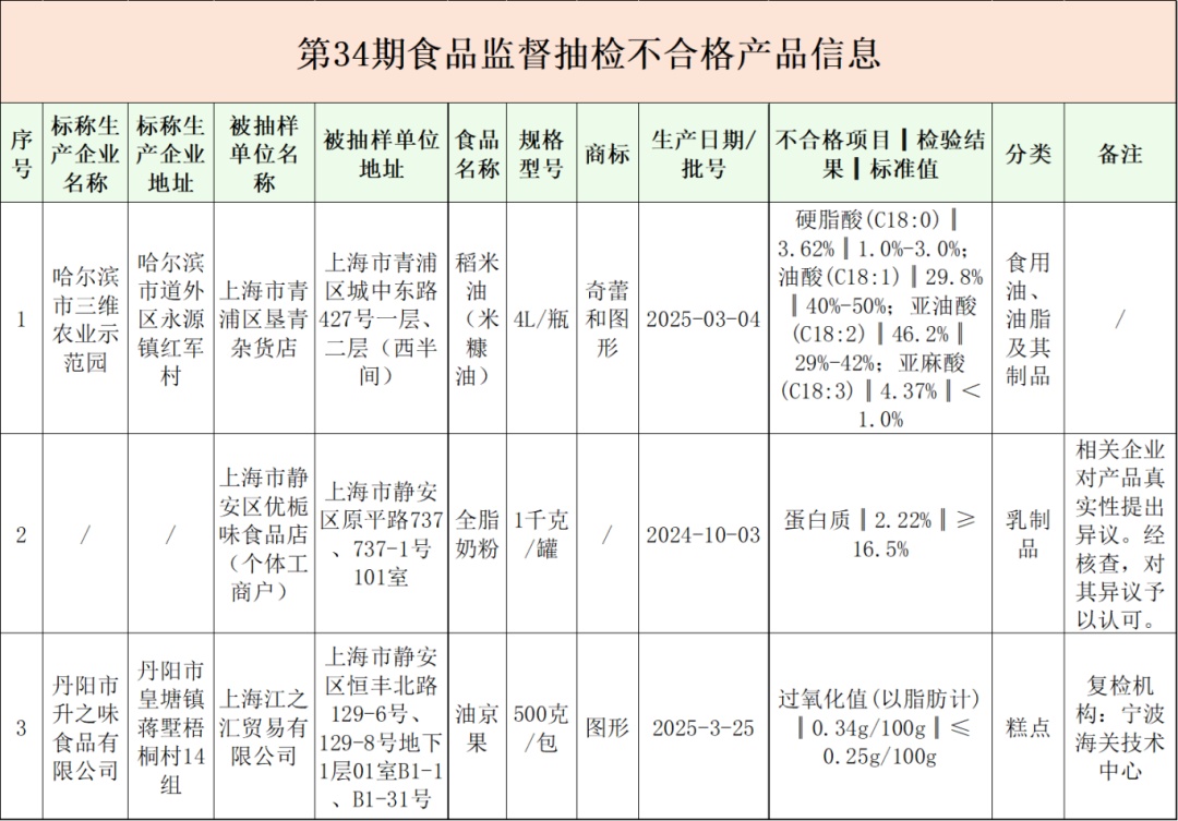 上海市市场监督管理局2025年 第34期省级食品安全抽检信息