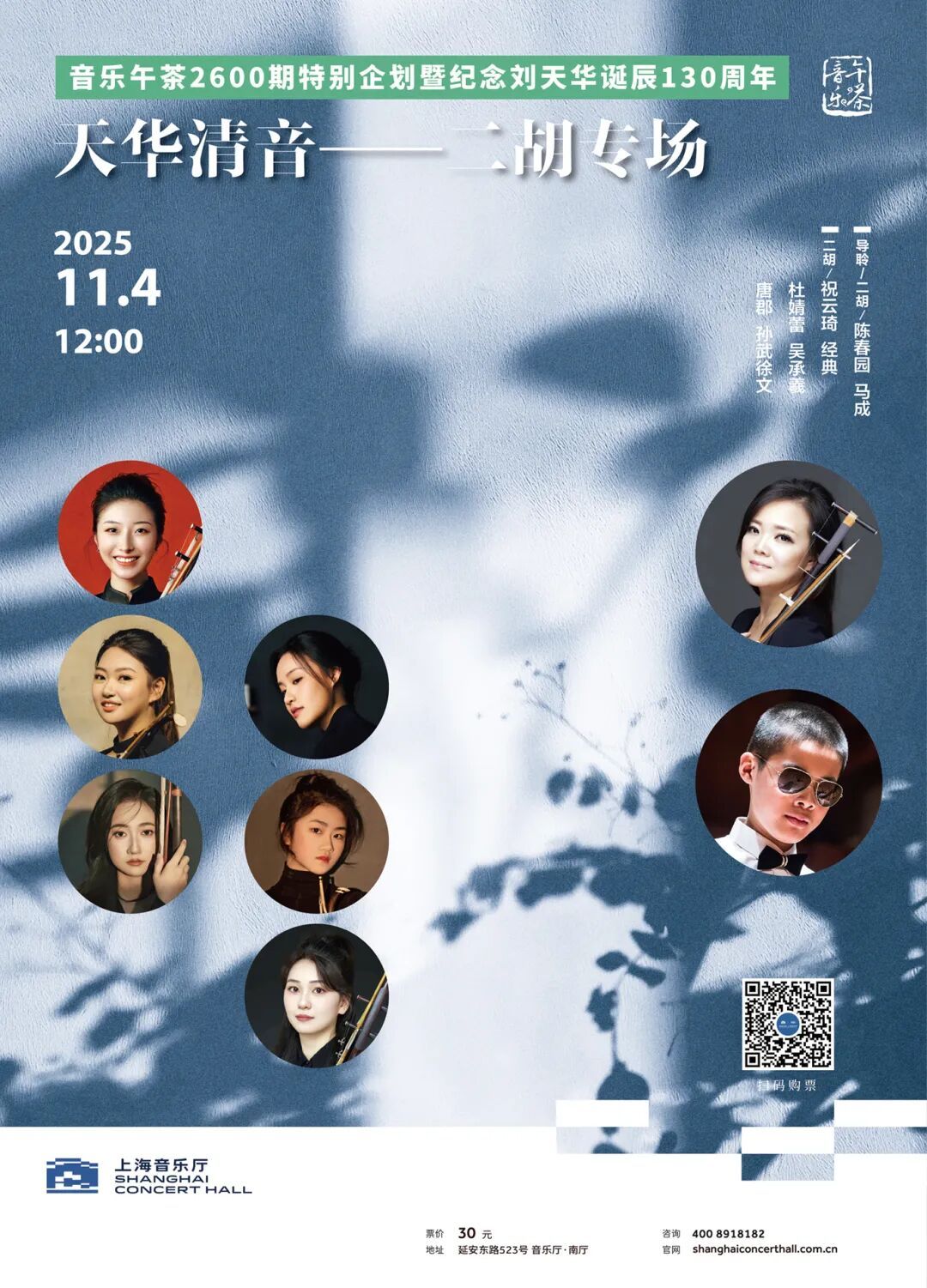2025年11月4日,上海音乐厅公益音乐会品牌“音乐午茶”将迎来第2600场演出,今年恰逢国乐大师刘天华先生诞辰130周年,音乐午茶2600期特别企划暨纪念刘天华诞辰130周年——天华清音·二胡专场,以十首经典致敬民族音乐先驱刘天华先生,在弓弦交错间重温时代的永恒旋律,感受民族音乐精神的永恒跃动。
