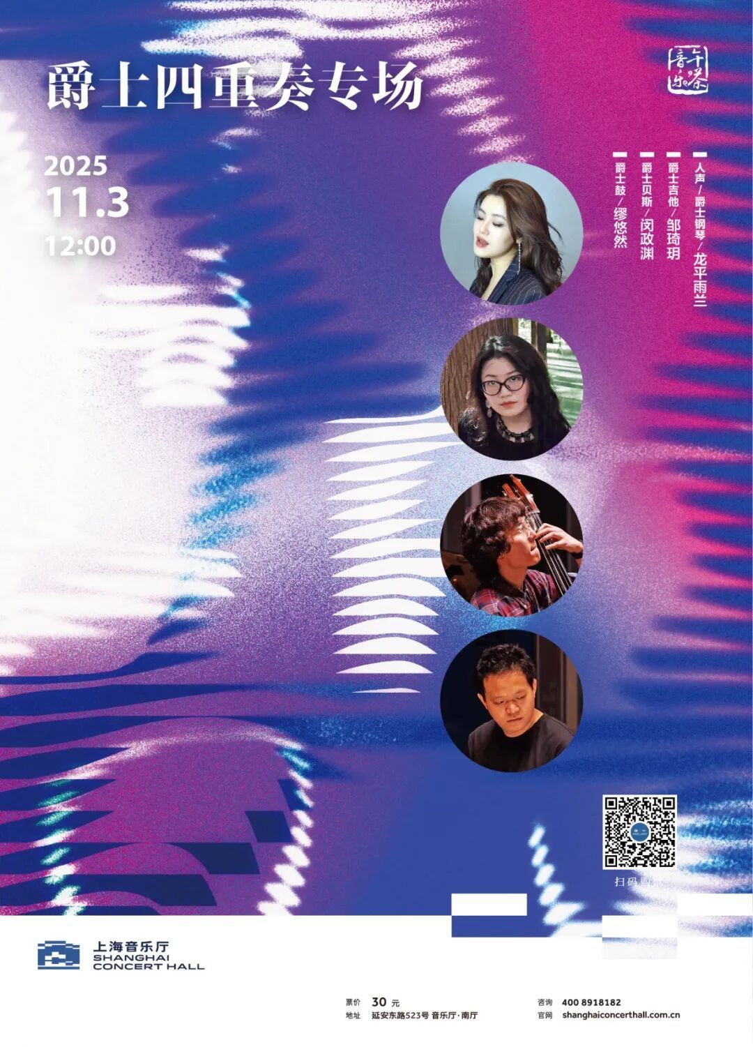 11月3日爵士四重奏专场,从美国、巴西到古巴,将开启跨地域爵士之旅,更有爵士改编版云南民歌《小河淌水》,实现东方旋律与西方律动的惊喜交融。