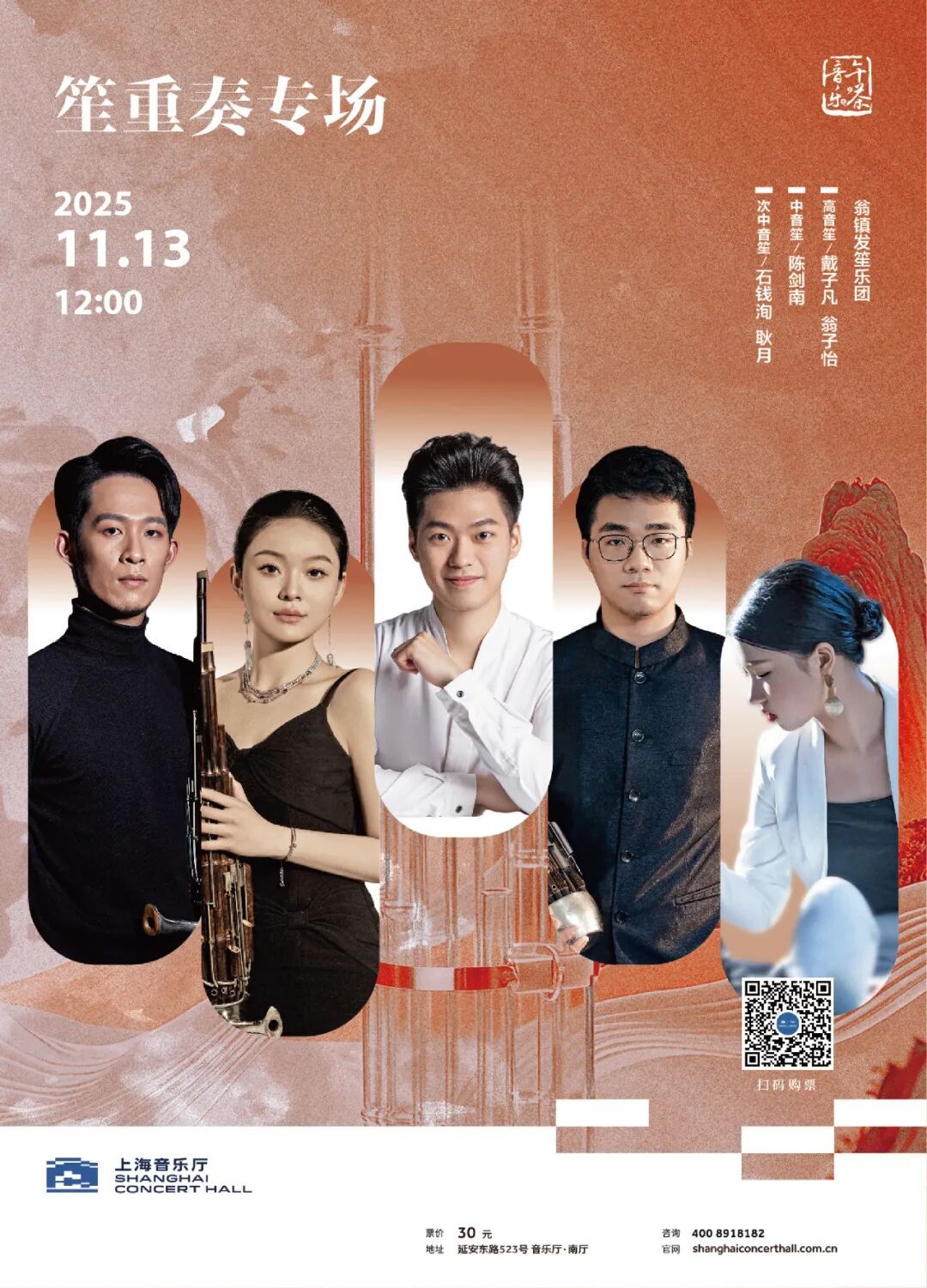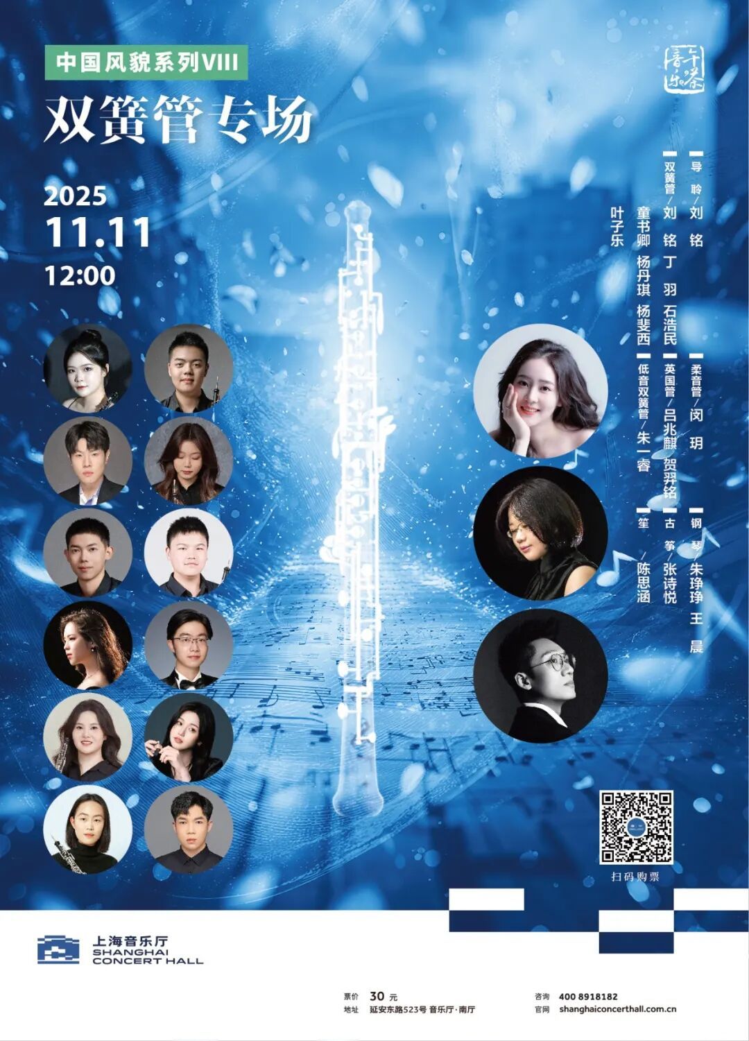 11月11日中国风貌系列VIII——双簧管专场,集结双簧管、柔音管、英国管、低音双簧管等多种管乐,搭配钢琴、古筝、笙,演绎《天山牧歌》《百鸟朝凤》等中国作品,用西方管乐奏响东方韵味。