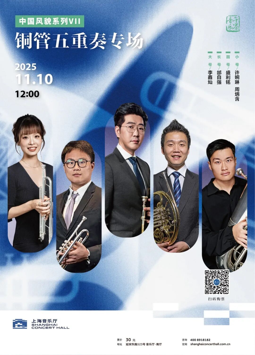 11月10日中国风貌系列VII——铜管五重奏专场,将多首中国经典旋律改编演绎。《掀起你的盖头来》《茉莉花》《彩云追月》……熟悉的民歌经铜管乐器诠释焕发新生,搭建起中西方音乐对话的音符桥梁。