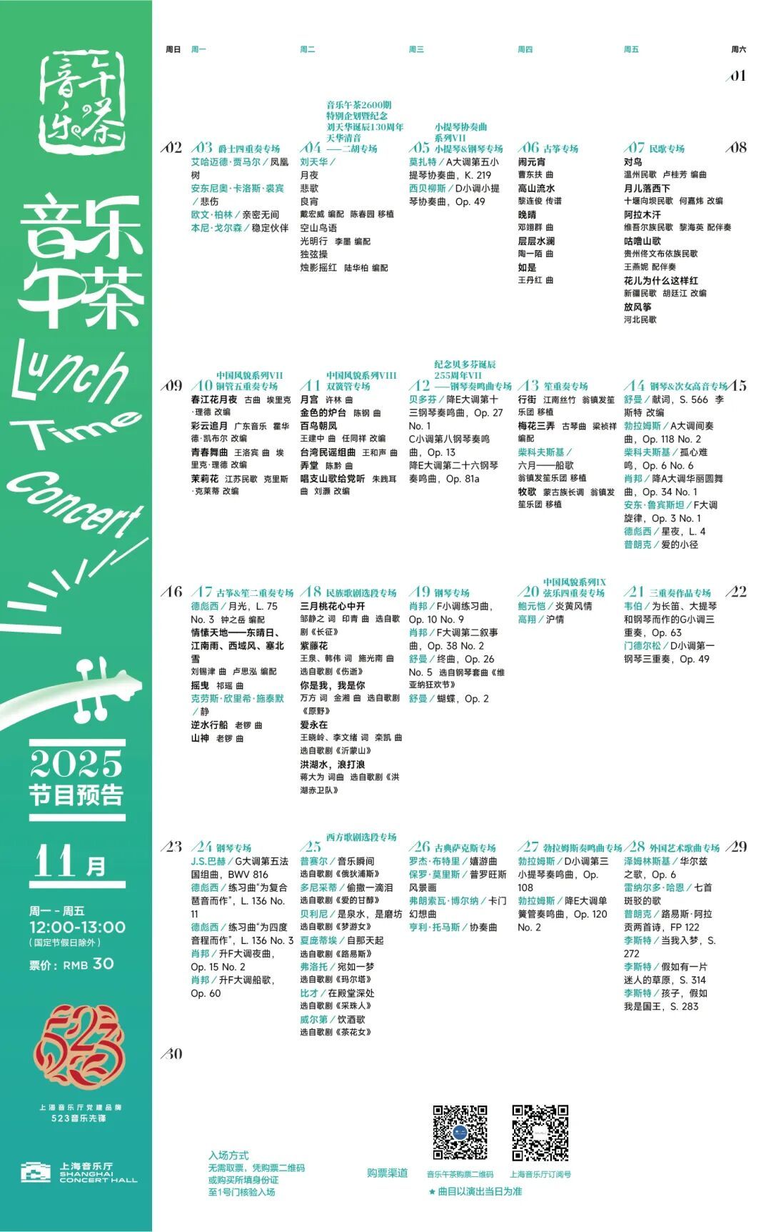 秋末余韵,乐音炽热——“音乐午茶”邀您共赴一场11月的演出之约:东方丝竹传新韵,西洋管弦咏乡音。;不仅有贝多芬等古典大师的经典曲目,亦有现代爵士乐曲的悠悠回响,让我们在冬初的凉意内,享受这沁人心脾的乐音旋律。