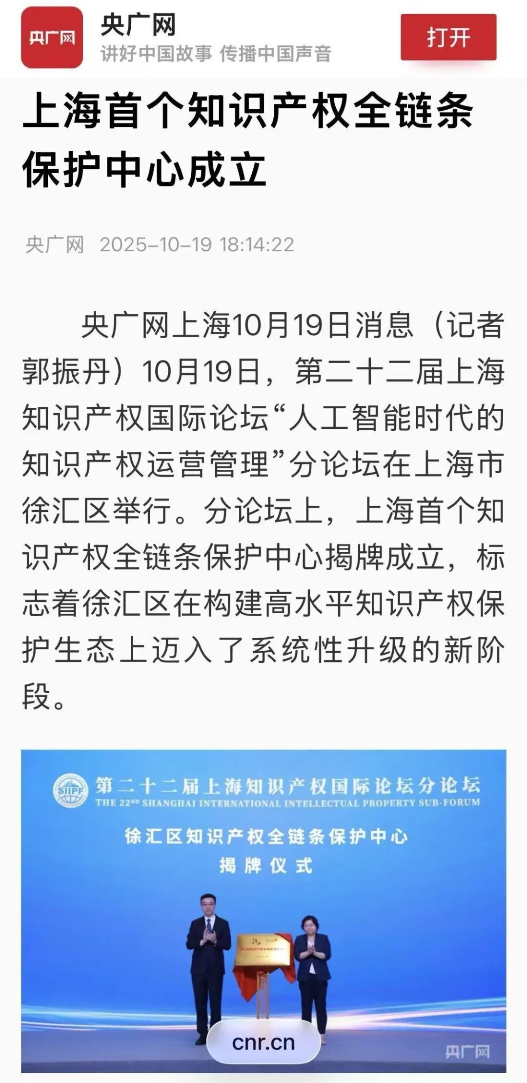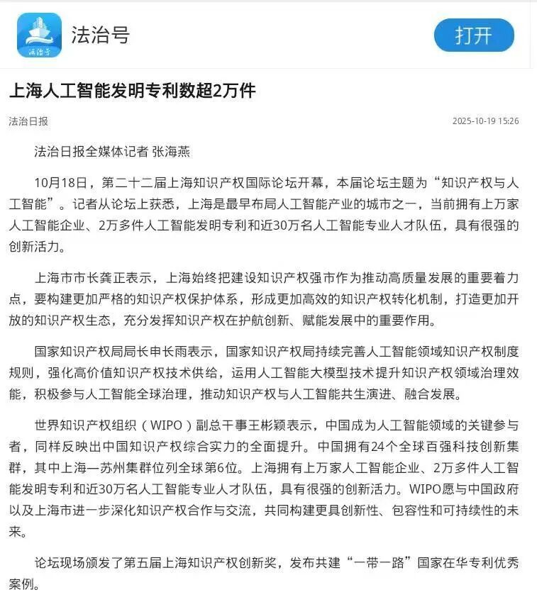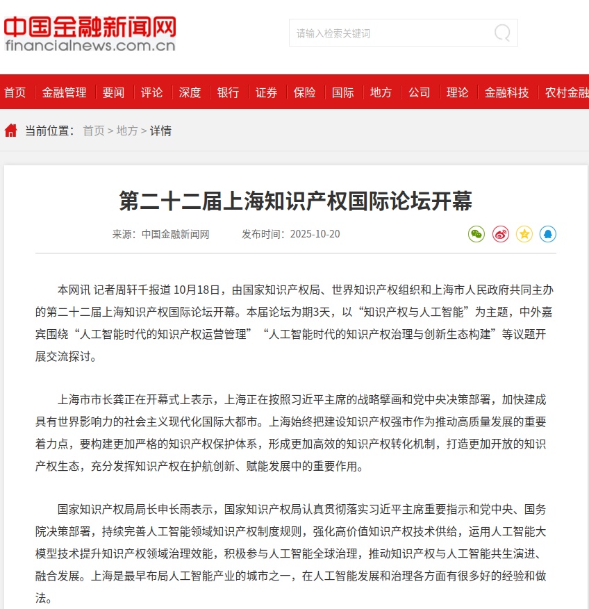 10月18日,以“知识产权与人工智能”为主题的第二十二届上海知识产权国际论坛(以下简称“论坛”)在沪举行。 自2003年以来,上海知识产权国际论坛已成功举办二十二届,成为全球知识产权领域具有重要影响力的活动和展示我国知识产权事业发展的重要舞台。 本届论坛举办期间,各大媒体围绕论坛开幕、活动内容、专家观点等进行了多角度报道,面向大众传播知识产权文化理念,展示知识产权与人工智能共生演进、双向赋能、融合发展的重要功能。