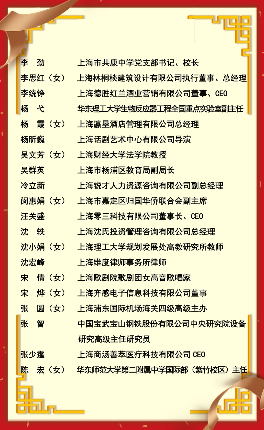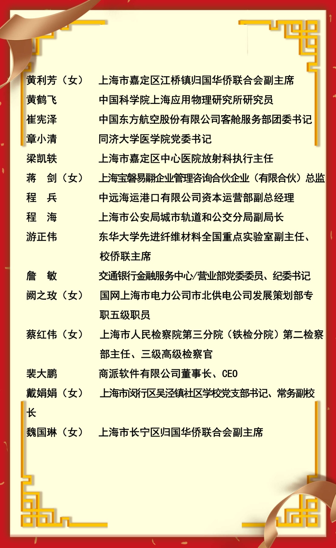 为表彰侨界杰出人物、先进典型,弘扬爱国奉献、开拓进取精神,发挥他们的示范带动、引领激励作用,团结动员广大归侨侨眷和海外侨胞为上海加快建成具有世界影响力的社会主义现代化国际大都市贡献智慧和力量,经组织评选,在上海市第十三次归侨侨眷代表大会召开之际,上海市归国华侨联合会、上海市人力资源和社会保障局联合表彰了10名“上海市侨界杰出人物”和一批归侨侨眷先进个人。 虹口区共有4名侨界人士荣获“上海市归侨侨眷先进个人”称号,他们分别是:
